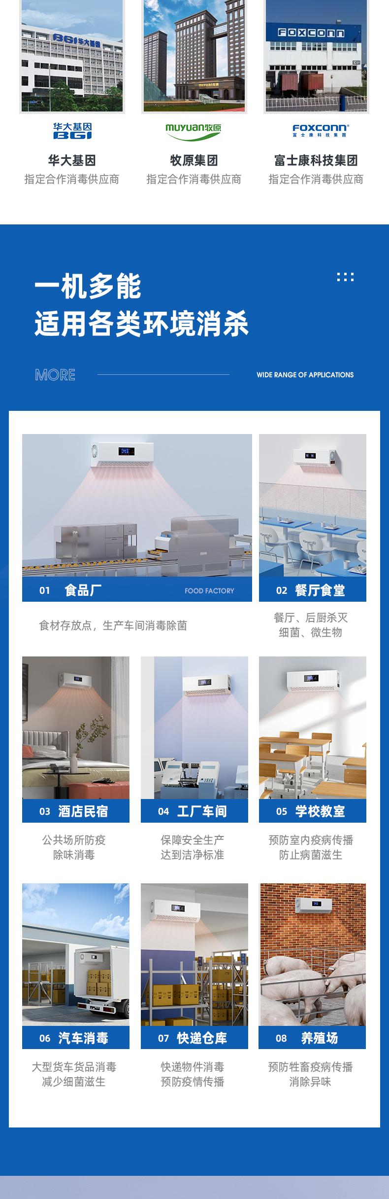 產(chǎn)品廣泛應(yīng)用于食品加工等場(chǎng)所的空間消毒,化妝品加工、包裝車間、無(wú)菌室的消毒殺菌,水產(chǎn)品、冷凍、腌臘食品的表面除菌,生產(chǎn)設(shè)備及工器具的表面消毒,各種娛樂(lè)場(chǎng)所空間消毒。