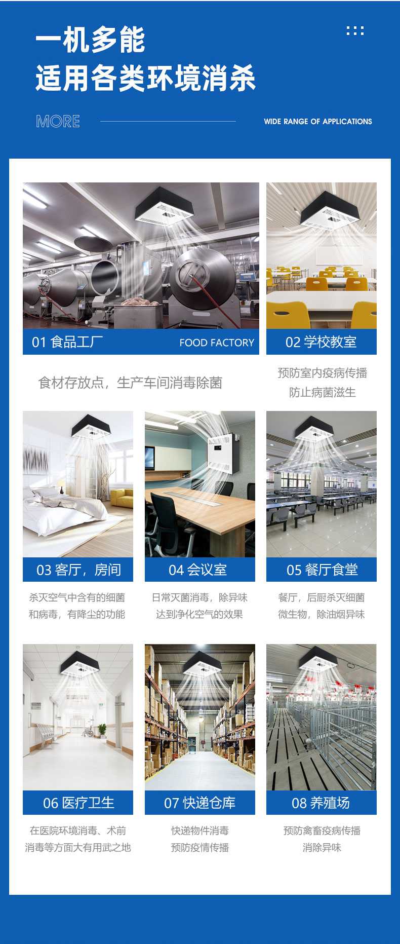 適用于對室內環(huán)境空氣和特定作業(yè)空間的消毒凈化。如辦公室場所、醫(yī)院、學校、會議室、檔案室、娛樂場所」賓館等;食品、飲料、醫(yī)藥等行業(yè)的生產車間、冷庫、更衣室和其他無HVAC潔凈區(qū)的空間消毒滅菌。