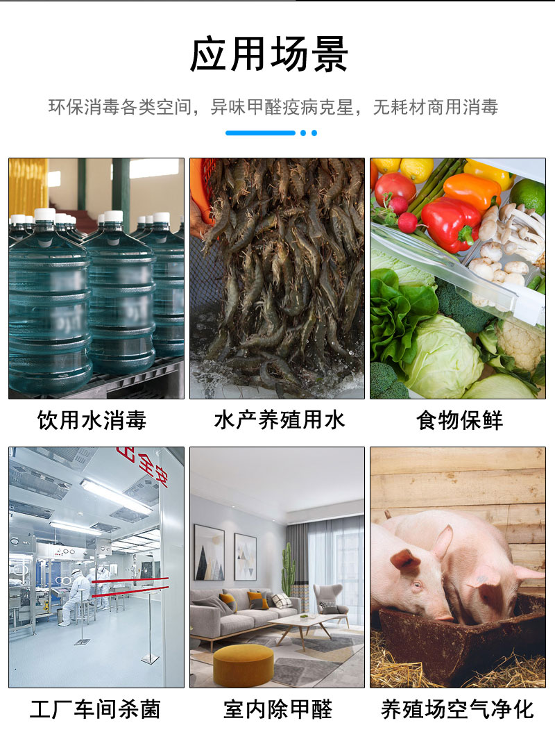 產(chǎn)品適用于對(duì)室內(nèi)環(huán)境空氣、水處理殺菌和特定作業(yè)空間的消毒凈化。如魚(yú)塘、泳池、辦公室場(chǎng)所、醫(yī)院、學(xué)校、會(huì)議室、檔案室、娛樂(lè)場(chǎng)所賓館等:食品、飲料、醫(yī)藥等行業(yè)的生產(chǎn)車(chē)間、冷庫(kù)、更衣室和其他無(wú)HVAC潔凈區(qū)的空間消毒滅菌。