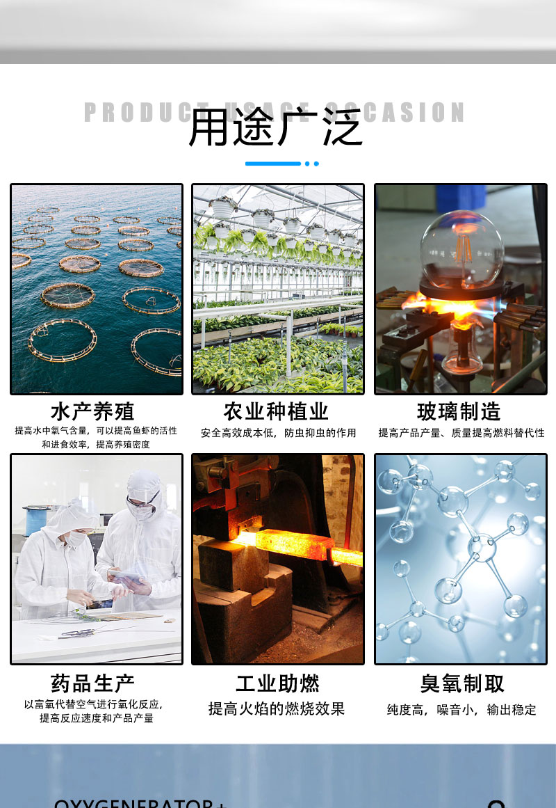 產(chǎn)品廣泛應(yīng)用于工業(yè)制氧、農(nóng)業(yè),水產(chǎn)養(yǎng)殖增氧、藥品生產(chǎn),水處理增氧,玻璃制造和臭氧制取、助燃、醫(yī)療氧艙制氧等