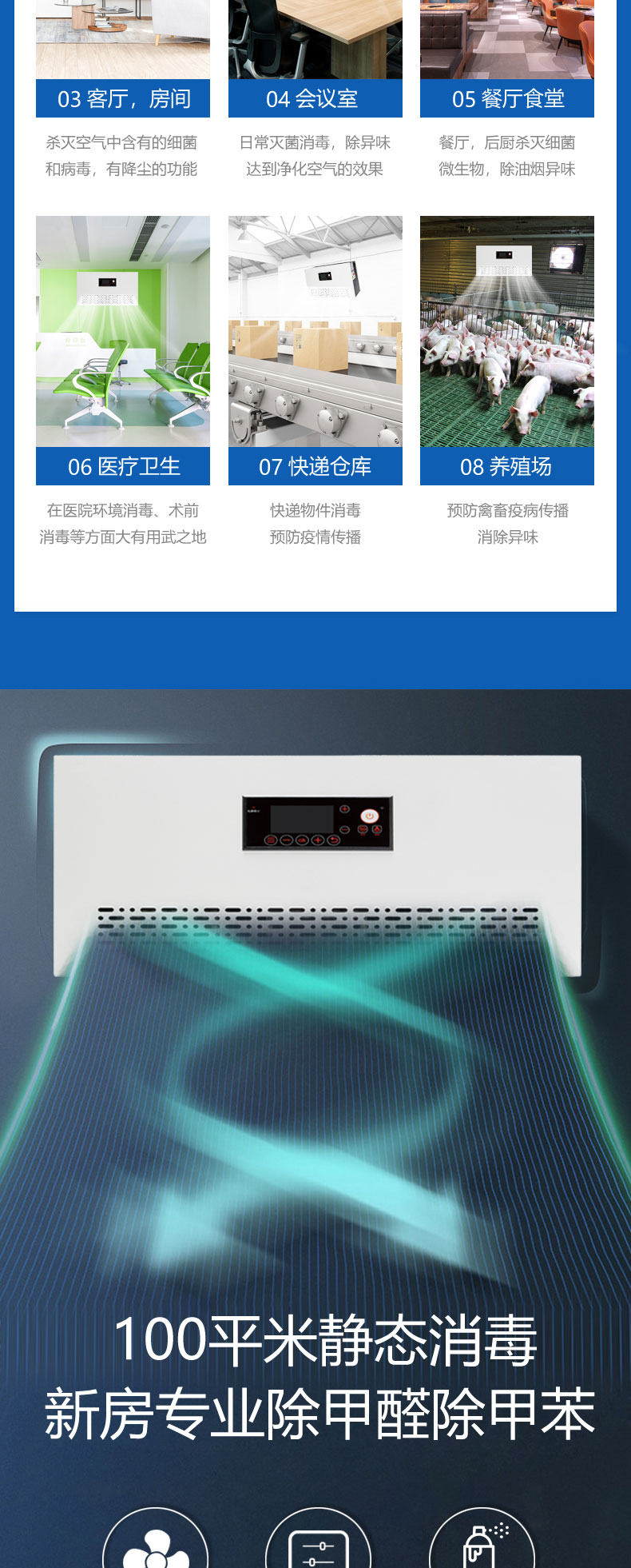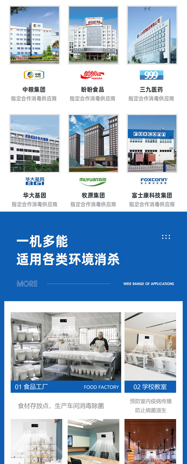 產(chǎn)品廣泛應(yīng)用于食品加工等場所的空間消毒,化妝品加工、包裝車間、無菌室的消毒殺菌,水產(chǎn)品、冷凍、腌臘食品的表面除菌,生產(chǎn)設(shè)備及工器具的表面消毒,各種娛樂場所空間消毒。
